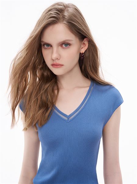 【官網獨賣】涼爽透膚織帶V領小蓋袖冰爽絲上衣-藍