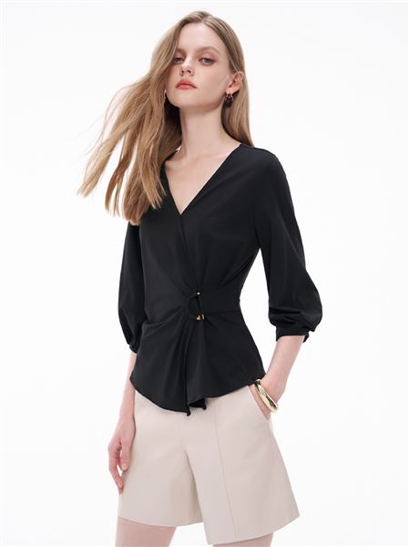 人氣追加 | M+| 氣質交叉V領傘襬冰瓷棉上衣-黑