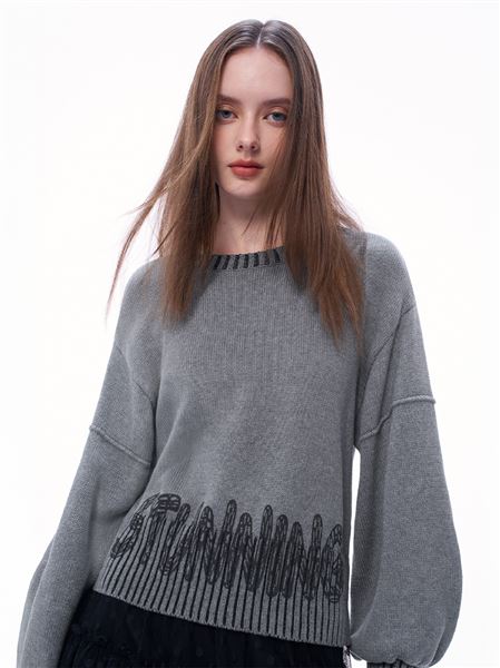 塗鴉文學落肩泡泡袖純棉針織上衣-灰