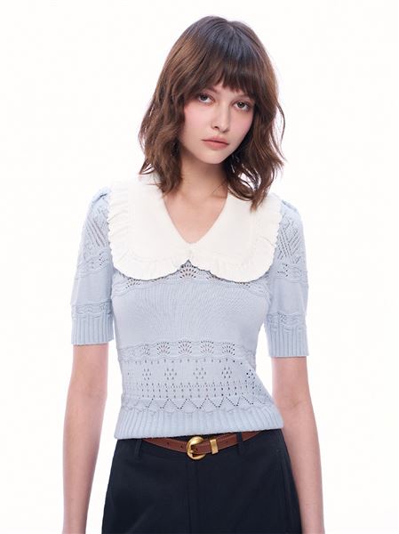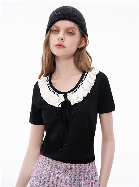 【官網獨賣】甜美少女鈎織花邊領五分泡泡袖針織上衣-黑