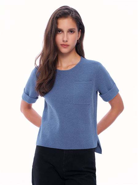 【官網獨賣】挺版嫩彈反褶袖搖粒絨開衩針織上衣-藍