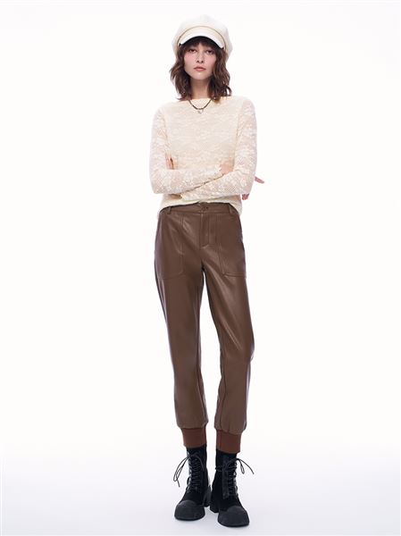 【絕版珍藏】潮酷個性皮革中高腰窄管褲-咖啡
