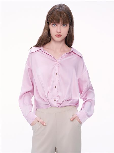 知性美扭結玫瑰金釦緞面襯衫-粉