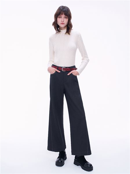 俐落感M字釦羊毛直筒寬褲-黑