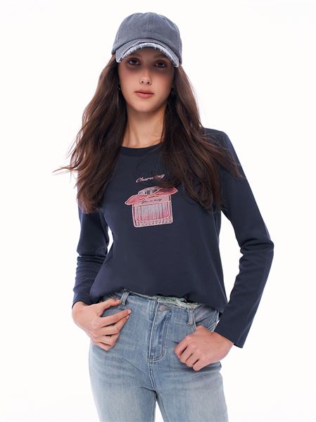 女性魅力香水瓶立體串珠蝴蝶結上衣-深藍
