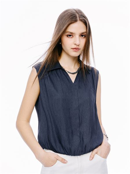 M+ | 絲光空氣感立體抓褶V領上衣-深藍