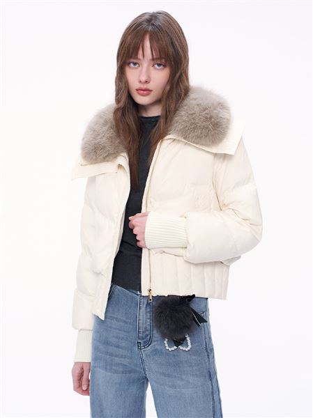 人氣追加 | M+ | 輕盈可拆式仿貂毛領鴨絨外套-米白