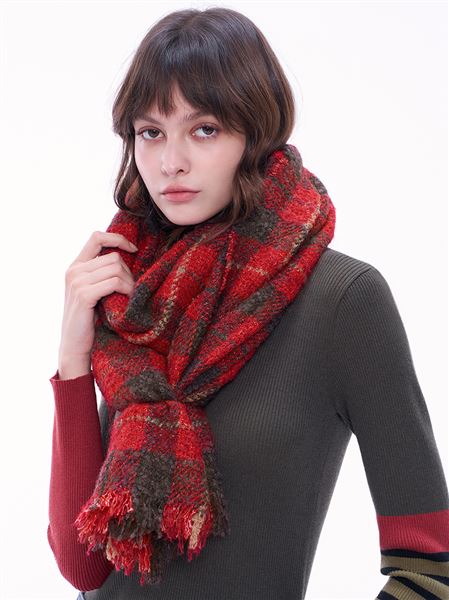 冬意日記撞色格紋羊毛圍巾-紅底花布